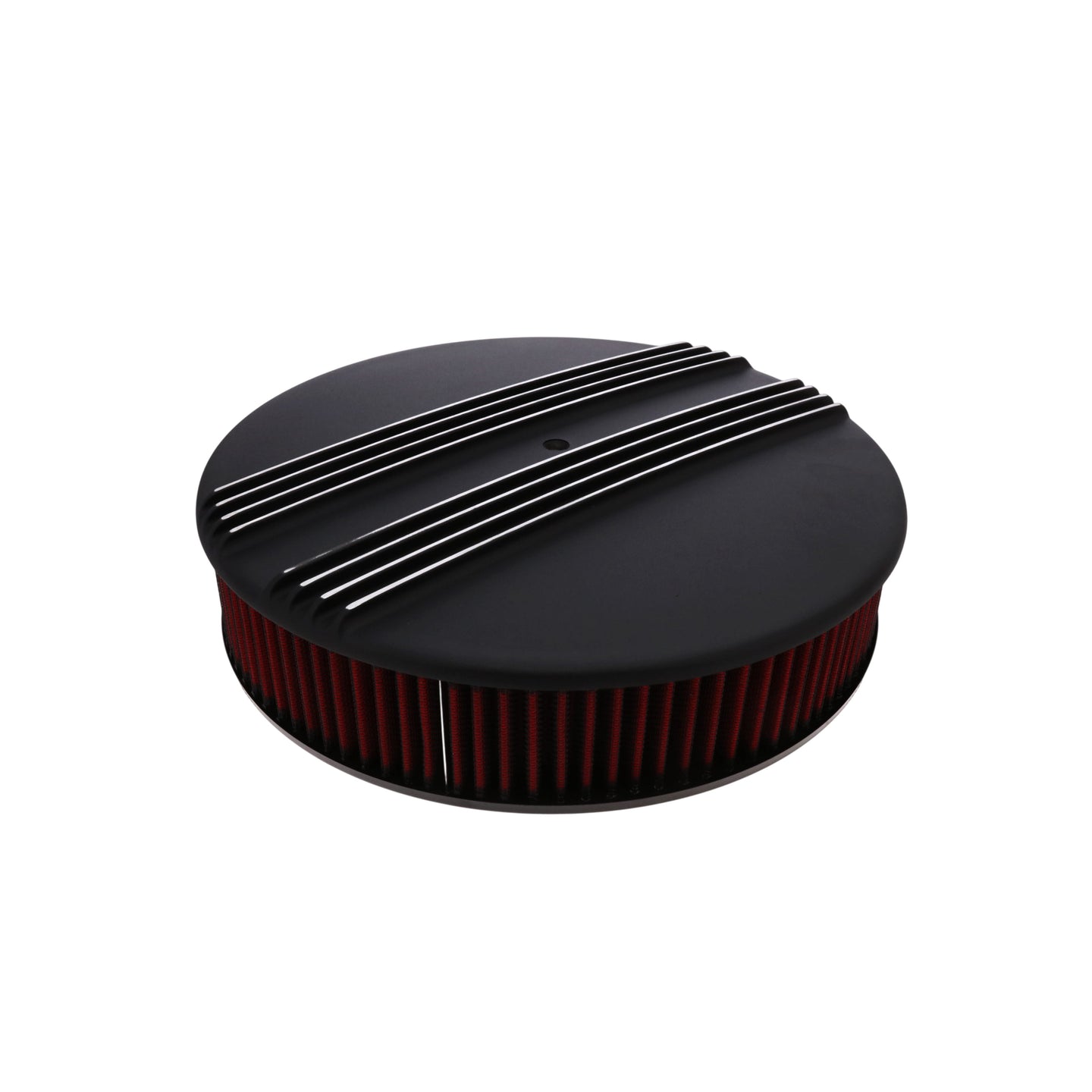14" X 3" Center Finned Round Aluminum Air Cleaner Kit, Red washable Filter, Flat Base - Black