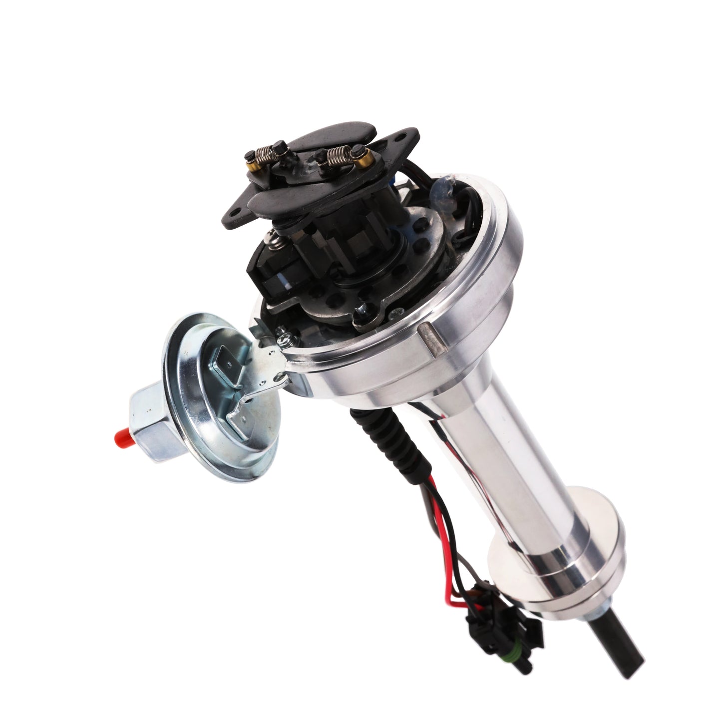 TSP Pro Series Ready to Run Distributor is perfect for a street performance upgrade. It features a CNC-machined billet aluminum body and hardened steel shaft, with a sealed ball bearing on top and a sintered steel bushing on the bottom. It also comes with a fully adjustable mechanical advance, vacuum advance, magnetic pickup trigger, and a high-output circuit board module with digital tach output. The dielectric cap comes with solid brass terminals and a color-matched wire retainer.