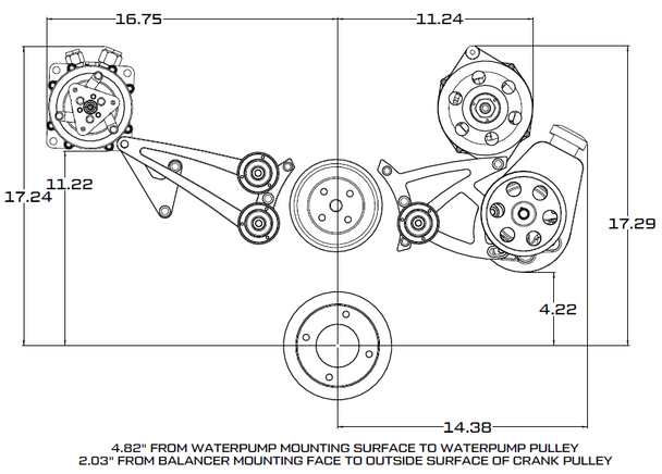 • Requires 4 bolt pattern on Harmonic Balancer and 11 Bolt water pump that is 4.5" tall