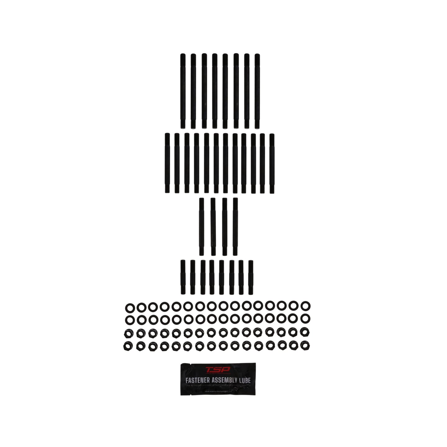 TSP's fasteners are composed of 35 chromoly steel for a minimum tensile strength of 190,000 PSI. Threads are rolled after heat treatment and then tested for tensile and yield strength. All hardware is then given a black oxide finish and oil coating to protect from rust and corrosion.